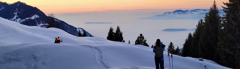 Treffpunkt ist bei der Bergstation der Sportbahnen Kerenzerberg. Wir rüsten Euch mit Schneeschuhen aus und wandern dann gemeinsam durch die verschneite Glarner Bergwelt.