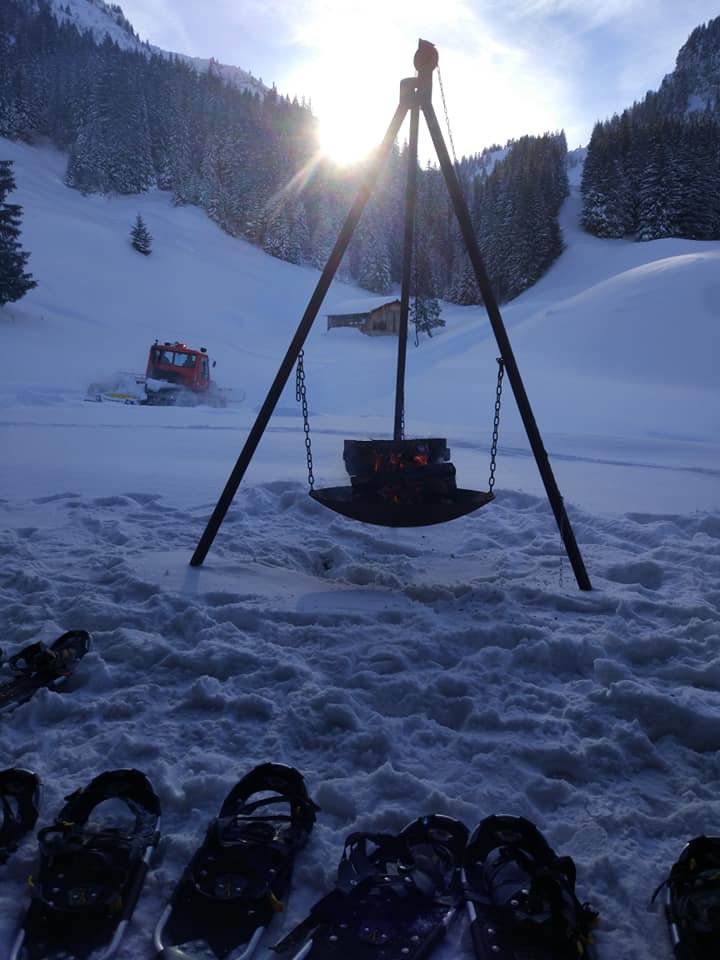 Am Ende der Tour erwartet Euch im heimeligen Alphüttli ein heisser Glühwein am Lagerfeuer, bevor Ihr in geselliger Runde das feine Fondue geniesst. Für Gruppen bis ca. 25 Personen bietet sich auch eine Uebernachtung im Alphüttli an (Mehrbettzimmer)